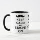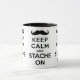 Black keep calm and stache on . Choose the background colour you want by clicking Customize it - Edit - Background. To change size has your taste. This design makes reference to the famous poster appeared during the Second World War.