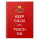 This notebook features a red background, with an image of a green apple on three red books, with the text, "Keep Calm and Teach On".