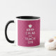Pretty fuchsia magenta pink plaid background with white "keep calm and teach on" text, a fresh and feminine gift for the female teacher to provide motivation and inspiration from the classic "keep calm and carry on" British wwii propaganda. A lovely teacher appreciation gift. Copyright © www.CuteComfy.com