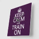 This reads Keep Calm and Train On, in the style of the classic keep calm poster. It's a clean simple design with the traditional crown at the top. Perfect for everyone from personal trainers, exercise enthusiasts, to train spotters.