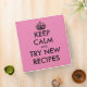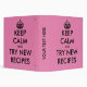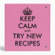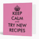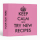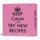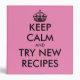Keep calm and try new recipes funny custom pink 3 ring binder. Personalized kitchen folder for keeping recipes and more. Fun keep calm and carry on quote with modern typography and crown. Pink or custom colour. Handy gift for chef, cook, mom, friend etc. Make your own recipe book. Inlays not included.