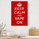 A vaper's funny rendition of the famous "Keep calm and carry on" World War II effort poster. The slogan is Keep Calm and Vape On and the color is red. Vape on and be inspired, ecig lovers!