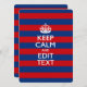 Have your personalized Keep Calm saying on this fine custom gift for yourself or for someone special on your list. Offered on a vibrant stylish red and blue horizontal stripes decor. Humourous or whimsical try on your creative words on the two editable text fields you see on this product page. Remember to use CAPITAL letters for best results.