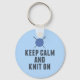 Funny Keep Calm and Knit On design makes a cute knitting gift. Knitter humour quote under pretty blue yarn and knitting needles.