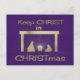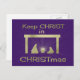 Simple nativity scene, dark purple background, shaded gold silhouette figures. Baby Jesus accented with beams of light. Keep CHRIST in CHRISTmas. It's less expensive to mail post cards than regular ones.