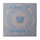 The central motif showcases a symbolic blue and gold crown, representing focus and inner royalty. This crown is set against a dynamic, geometric background: a soft lavender/light blue grid pattern overlaid with a radiating starburst in muted purples and creams. The powerful message "KEEP IT SIMPLE" boldly frames the top and bottom of the design in a coordinating light blue. This elegant combination of clean geometry and motivational symbolism in a sophisticated, lighter shade is ideal for anyone seeking clarity and a mindful approach to their daily life with a calm, understated aesthetic.