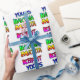 This clear arrangement makes the message easy to read, while the white background provides a clean canvas that allows the colourful text to stand out.