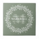 Floral Wreath Calligraphy Typography Monogram Ceramic Tile in Sage Green and White - Stylish green and white monogrammed ceramic tile gift for newly wed a couple that features a custom monogram, groom & bride names, last name, and wedding date templates surrounded by a bold floral line art wreath. A thoughtful keepsake gift for a couple's housewarming party or wedding present. ©sweetwhimsypaperie