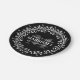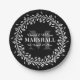 Floral Wreath Calligraphy Typography Monogram Paper Plate in Black and White - Stylish black and white monogrammed paper plates decor featuring a custom monogram, groom & bride names, last name, and wedding date templates surrounded by a bold floral line art wreath. ©sweetwhimsypaperie