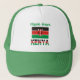 Personalized trucker hat features the Kenyan Flag with the word KENYA below in the colours of the flag. Above is a place for a name to personalize in green letters. A special way to honour your heritage. Fun to wear to family reunions, travel groups, and clubs. Thoughtful gift, too.