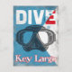 Key Largo Florida vintage scuba mask travel poster design. A blue and white diver down flag background with a retro scuba mask and word "Dive" at the top.