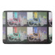 The colourful artwork on this large Bath Mat was made from an original photograph by ZoeSPEAK of a bicycle parked outside a shop in Key West, Florida. Clothing from the shop hangs on the open door behind the bicycle. The photo is done in four colour schemes, red bike, blue bike, green bike and yellow bike, with corresponding clothing colours. The backgrounds are in muted shades of mauve and olive greys, and the overall background is a marbled black.