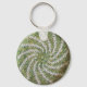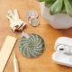 Photo image of a round crocheted pad with variegated greens as a background and white as the spiral arms radiating out from the centre.