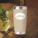 Gift your wedding groomsman this personalized, stainless steel, thermal tumbler with his name in stylized script in a white oval design. Background and script is a trendy khaki colour. Personalize your thermal tumbler by editing and replacing groomsman's name with desired name.