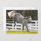 A Dapple Grey horse photographed mid-kick on a sunny Fall morning. Dapples are a colour variation most commonly seen on grey horses.