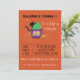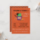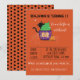 A cute orange invitation for a child's Halloween birthday party featuring a cartoon black cat behind a cupcake with a green icing . Use the template fields to add your onw info . The back has a simple polka dots pattern .