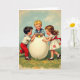 This design shows three rosy-cheeked children—two boys and a girl—clustered close together around an oversized cracked white egg in a grassy outdoor scene. A fair-haired boy in a sailor-collared top faces outward with a bright grin, while the other two lean in toward the opening, their shoulders nearly touching in a friendly, conspiratorial way. The dark-haired boy wears red trousers, and the girl wears a white dress with red floral details and a long red bow at her waist, adding a gentle, affectionate touch to the group’s closeness. From the jagged break in the shell, a tiny yellow hatchling peeks out, drawing all three sets of eyes toward it like a shared secret 🐣🌷. Behind them, a pale blue sky with thin, wispy clouds keeps the scene light and open. Near the top, a short Easter greeting sits in small, soft-colored lettering, centered above the children without covering the main artwork. The egg’s sharp cracks frame the little yellow face, and the green grass below is brushed in soft strokes around their feet 🐰.