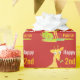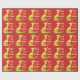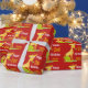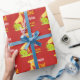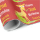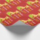 Kids Happy Birthday Personalized Giraffe Animal Watercolor Wrapping Paper. Bright red background with a repeating pattern of fun giraffes. Watercolor style giraffes in yellow and orange behind green bushes. Personalize in white and yellow fun font to say HAPPY BIRTHDAY with name and age of birthday boy or girl.