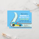 Organise a race car birthday party for a birthday boy who love racing cars and toys! This colourful and bright kids birthday party invitation includes racing elements like the black and white chequered flags and race track linings, a blue and yellow small sports car with a little racer inside wearing a red helmet. Even the invitation write up matches the race theme where the venue is named tongue in cheek as a race track and the phrase "race over to". Personalise with your party details including the number on the car! Background colour can be changed to make it your very own invitation!