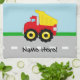 Adorable and fresh primary colours are the key element in this cuper cute kids or boys dumptruck construction theme gift. Features a work dump truck with a red body, yellow dump bed and wheel chucks, and grey exhaust and bumpers. The background contains a grey asphalt road with white markings, green for grass and blue for a sky. A great theme for a boys decor, builder and building trades or children's big machine theme room decor. All Designs Copyright © www.CustomInvitesOnline.com
