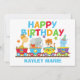 These adorable circus animal train happy birthday card features zoo animals out on a safari. The train contains a giraffe, elephant, tiger, and a cute hippo above your children's monogram written under cool orange, green, red, and blue colors.