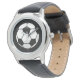 Kids classic black leather strap watch shown with a soccer ball print. Choose this watch from several styles. Customize this watch or buy as is. Stock Image