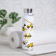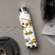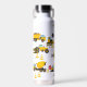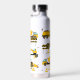Cute childrens water bottle featuring construction vector drawings including stop signs, a dump truck, a digger, a cement truck, a wrecking ball crane, splatters of dirt, plus your kids initial and name.
