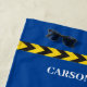 Cool blue custom construction vehicle beach towel for a child who loves yellow construction vehicles in black and yellow. Fun vehicle decor for a little boy who loves cars and trucks. Customize with your kid's name under the black and yellow caution tape. Features a concrete mixer and a digger with a backhoe.