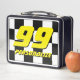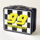 Kid's custom lunch box with chequered car race flag design. Retro style metal lunch box with name of child and number. Personalized gift ideas for little boys and girls going to kindergarten and preschool. Classic metallic lunchbox with handle. Cute Birthday or Holiday gift idea for son, grandson, granddaughter, daughter, cousin, nephew etc. Add your own name, monogram initials or funny quote. Available in many colours. Cool back to school supplies with automotive theme.
