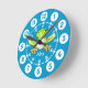 Kids graphic wall clock. This colourful cute fun kids clock includes minutes and hours to help make child's play of telling the time. Customise with the short name of your choice, currently reads Alex. Designed and painted exclusively by Sarah Trett. A great addition to a frog or amphibian lover kid's bedroom who is learning to read a clock face.