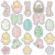 Delight your child with this 20-sticker pack of Easter images, featuring bunnies, chicks, Easter eggs, bows, butterflies, flowers, and Easter basket.