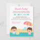 Invite your children guests for a fun time at the beach with this colourful beach themed party invitation! The invite has a boy and girl in striped swimsuits. They are having fun in the cool blue sea water playing on a beach ball. A large beach umbrella and a beach chair is in the background. Reverse page is a slanted stripes pattern. Good mix of colours which include pink, yellow, mint, turquoise. Personalise easily with your party details.