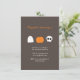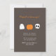 Kids Halloween birthday party invitations, by red_dress, featuring a cartoon ghost, Halloween pumpkin and spooky skull, printed on a brown background.