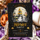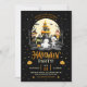 Enjoy this spooky Halloween costume invitation! It's the perfect way to invite guests to your child's costume party. This Halloween invite is designed with cute kids in costume, a haunted house, pumpkins, and bats on a chalkboard - like background.