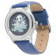 This kids watch is shown in stainless steel with a blue leather strap with a cute Halloween ghost print.