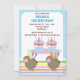 This cute kids birthday party invitation features two mice carrying two cupcakes on a platter over their heads.