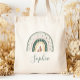This tote bag features a boho rainbow decorated with hearts and polka dots in earth tones of green, gold and dusty rose. Personalize it with her name in dark green handwriting script.