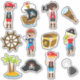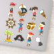 Delight your little pirate with this 12-sticker pack of 5 cartoon boy pirates, spyglass, helm, desert island, treasure chest, and pirate ship, tricorn hat, and hook.
