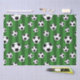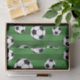 This fun kids sports equipment pattern has soccer balls on a green field striped background. The athletic gear design makes a cute addition to a birthday, Christmas, or other holiday gift, especially for soccer-loving boys and girls.
