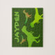 Kid's T-rex dinosaur puzzle with custom name. Prehistoric wild animal illustration with personalized text. Fun Birthday or Christmas gift idea for boys and girls into dinos. Green Terranosaurus rex silhouettes with bold typography template. Choose from small or big pieces to play with. Cute custom toys for children.