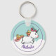 Kids keychain featuring a cute unicorn running on a cloud with a blue background.
