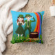 A boy dressed in green and a cute girl dressed in a pretty green dress with printed shamrocks fabric and wearing an emerald-green top hat is cheering and clapping her hands because it’s also her birthday. On the back of this pillow, there's an Irish Blessing. All text is personalizable.
