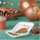 Fun Halloween paper plates for a kids Halloween party feature a large pumpkin gnome home and two gnomes standing on either side of it. There's a black cat and black spiders too. It says Happy Halloween at the top. This design is also featured on an entire party supply collection so be sure to take a look at all the fun items.