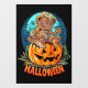 Scary Halloween scene with a teddy bear holding a knife while on a jack o'lantern, full blue moon and bats in the background.