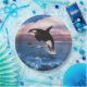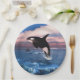A herd of orca killer whales swimming in the Arctic Ocean. Icebergs floating in the sea and by the sunrise shimmering the clouds pink. Customize to personalized the gift product!