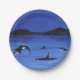 An acrylic painting of a pod of orca under a starry, evening sky.