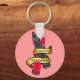 A keychain for teachers with a light pink background featuring a vintage tattoo inspired design of two crayons (pink and grey) wrapped in a banner that reads "Kindergarten Teacher." Or, personalize with your own text.