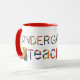A GREAT Kindergarten Teacher's Mug with lettering made from pencils and crayons and a drawing of a school bus and and apple. It's a perfect gift for any Kindergarten Teacher. Other items with similar designs available in our store at - www.zazzle.com/Teach1029