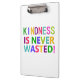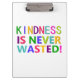A great clipboard for teachers, educational professionals, parents, and coaches, this inspiring white clipboard with various bright colour text reads Kindness is Never Wasted!