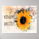 An original sunflower watercolor design positive quote poster has kindness matters.. Art copyright Ann Powell all rights reserved.